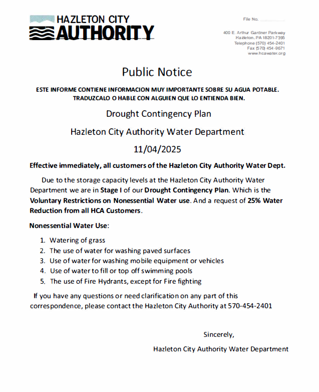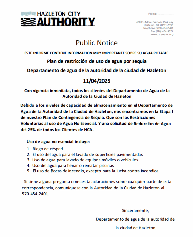 El 7 de diciembre de 2023, en la reunión de la Junta de Autoridad de la Ciudad de Hazleton, se aprobó una resolución para aumentar todas las tarifas del agua en un 12%. La última vez que se aumentaron las tarifas del agua fue en 2011. Desafortunadamente, el aumento de los costos de gastos en todos los ámbitos, junto con los aumentos en los proyectos de mejora, ahora requieren el ajuste de las tarifas. El aumento de la tarifa del agua entrará en vigor el 01 de enero de 2024.