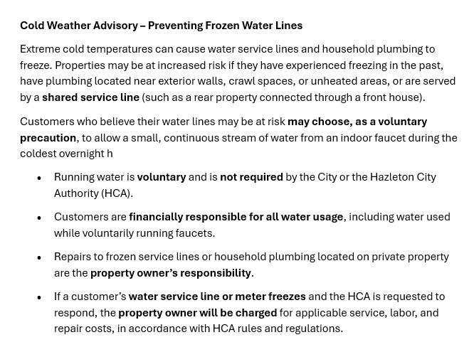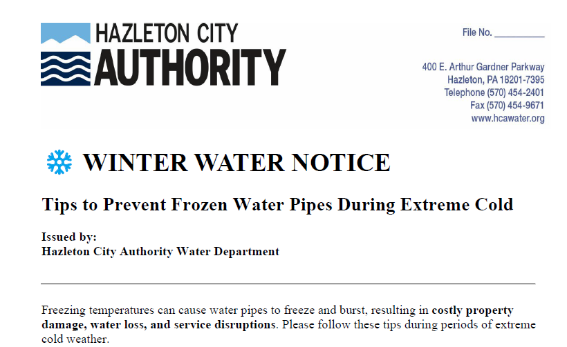 ATTENTION: The Hazleton City Authority has been receiving a large volume of calls form customers with frozen water meters and water lines. Please read the message below and understand that you must be prepared when the extreme cold visits our area.